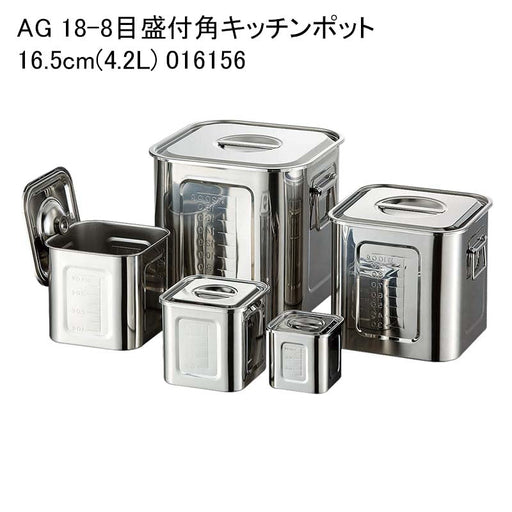 詳細を全部見る※画像は参考画像です。複数のAG 18-8目盛付角キッチンポットの画像です 商品詳細 商品名 AG 21-0目盛付角キッチンポット 16.5cm(4.2L) 016343 サイズ 165x165xH165 手無 入数 1 単価(税込) 4323.00円 商品説明厨房機器 キッ...