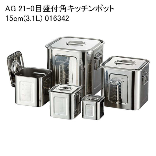詳細を全部見る※画像は参考画像です。複数のAG 18-8目盛付角キッチンポットの画像です 商品詳細 商品名 AG 21-0目盛付角キッチンポット 15cm(3.1L) 016342 サイズ 150x150xH150 手無 入数 1 単価(税込) 3784.00円 商品説明厨房機器 キッチン...